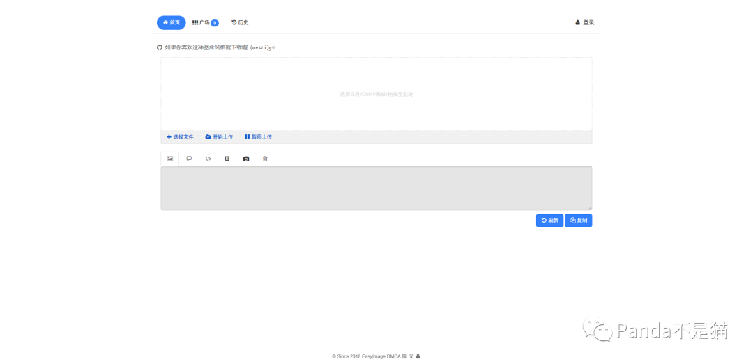 在不登录的情况下,会显示上传以及广场界面,上传支持生成多种格式,广场支持查看公开的图床图片。
