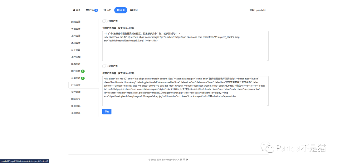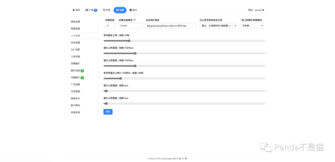 登录后便能看到多出来的设置与统计,设置中你可以自定义网站的展示信息,上传界面设置以及各项设置。可以看到功能很强大,甚至比兰空的自定义项还要多。