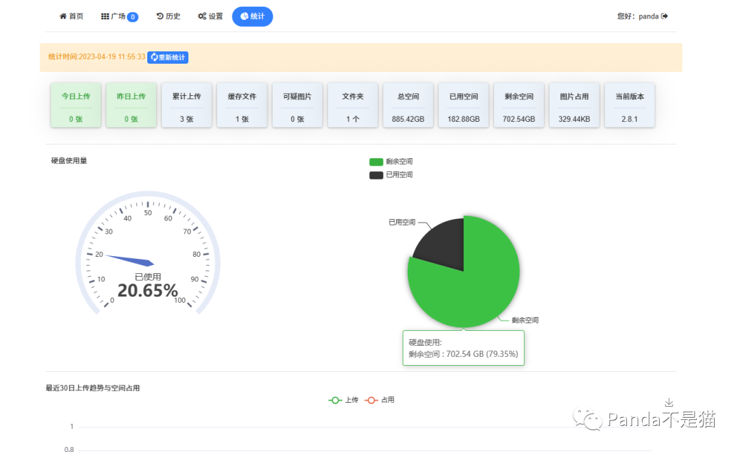 功能界面我这里就不一一展示了,感兴趣的可以自行部署了解,总之就是很强大就对了。同时该图床也支持统计界面,能看到显示的信息很全,界面也挺清爽,一目了然。
