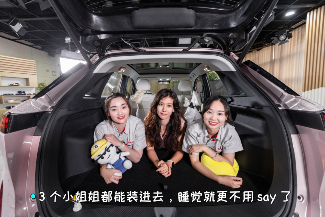 虽然八仔没有20个行李箱,但有小伙伴啊🥰3个小姐姐躺进后备箱,一点都不带挤的!这边风景独好🤭