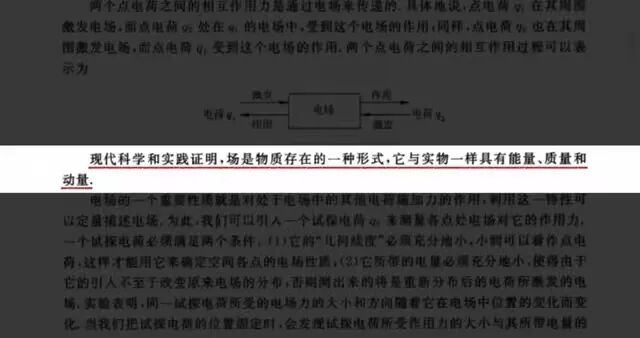 第一,场最初是作为描述某种物理作用的手段引入的。但以后发现场其实可以脱离产生场的源独立存在,最明显的例子是发射台天线中震荡电流激发了电磁波,当电流停止后,此前激发的电磁波依然向四周扩散,存在于空间,并能诱发接受天线传递信号,可见电磁波(场的一种)携带能量,根据质能原理也就具有质量(非静止质量)。光压实验表明电磁波具有动量,说它是客观物质并不出格。除此之外,场形态的物质与粒子实体能相互转化。正负电子对湮灭就是粒子转化为场(光子)的过程,同样也存在逆过程,光子传化为正负粒子对。所以需要扩展此前“客观物质由一系列粒子组成”的理念,场是物质存在的另一种形态,而且宇宙中物质极可能大部分是以场形态存在。