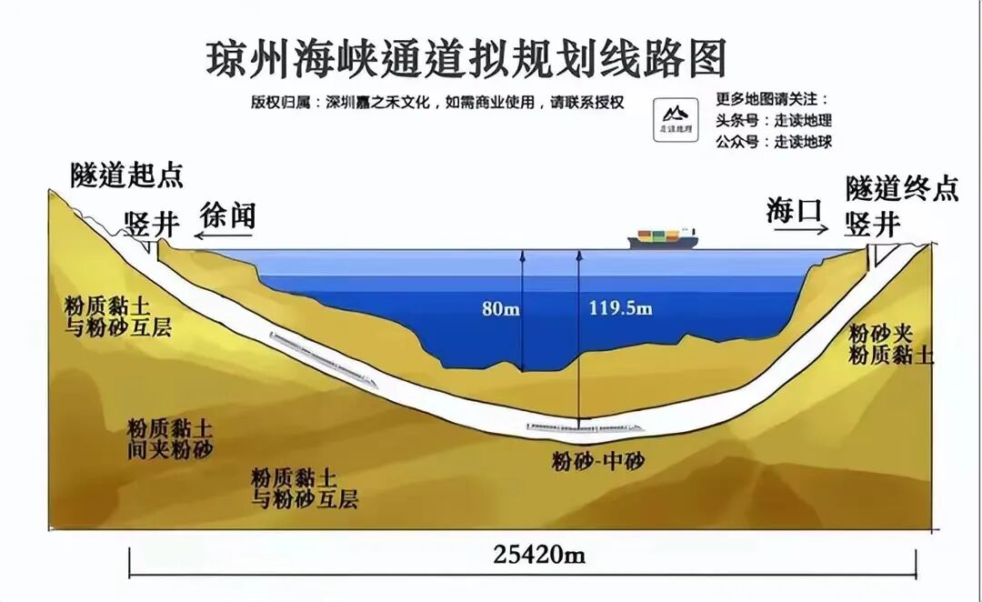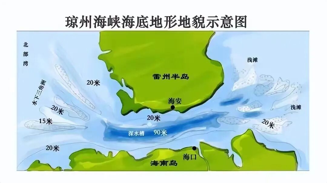 第六,琼州海峡最好是建海底隧道,因为夏季有台风,冬季有大雾,所以综合考虑还是建海底隧道具有优势。但是琼州海峡的最大海深要达百余米,直接在海底建隧道压力太大,建设运行具有巨大风险。其实可以换个思路,把合适的海底线路用填海的方式垫高加固,在不影响潜艇和轮船通行的深度铺设海底隧道,就可以做到既防台风又防大雾的影响,全天候保持进出岛畅通了。