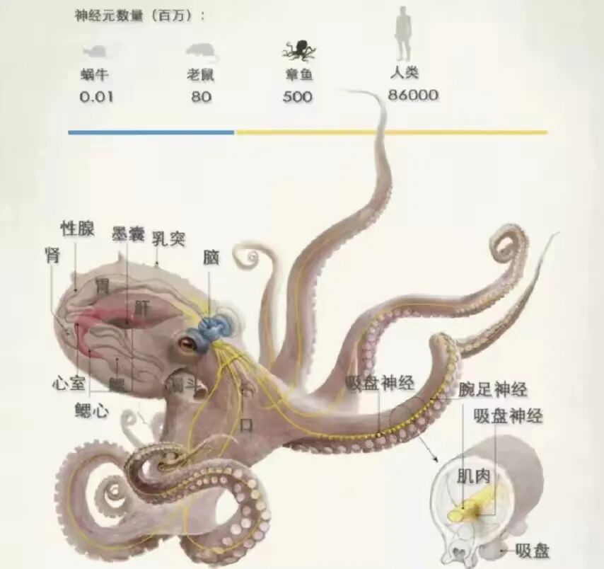 第四,章鱼就是因为太弱,才进化出现在这个样子。它主心脏太弱,所以进化出两个给腮供血的副心脏。它大脑神经系统太弱,所以进化出各个触手独立的神经系统。它身体体质和防御太弱,所以进化出独居方式,防止被大量捕食。章鱼的进化路径非常清晰,根本不是外星生物,就是远古孱弱物种不断适应海洋环境变化的过程,没有太特别的。