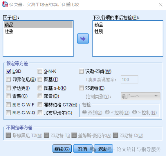 3、点击“事后比较(H)”对话框,将“药品”和“性别”移入到“下列各项的事后检验”列表框,并勾选“假定等方差”选项组中的“LSD”复选框。