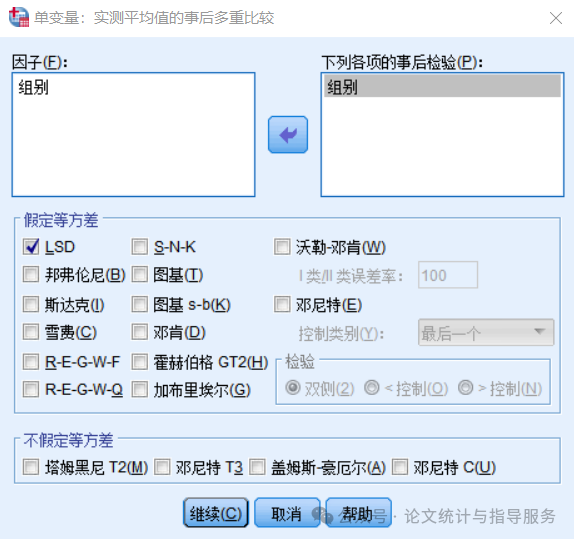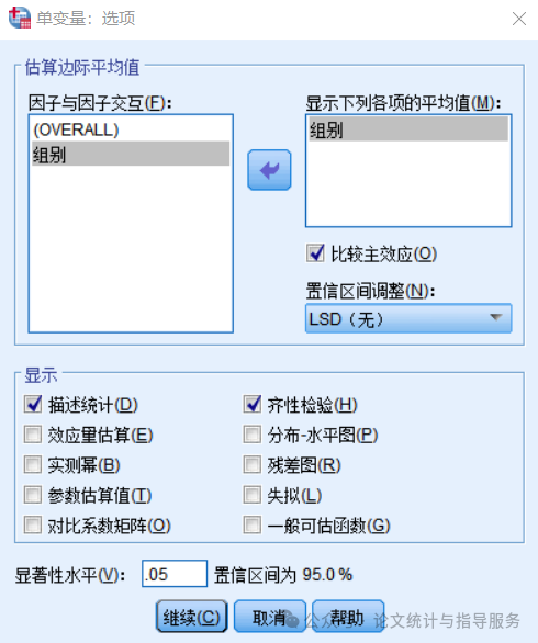 3、点击【事后比较】,在【事后比较】对话框中,将“分组”移入右侧的【显示下列各项平均值】框中,方法选择:“LSD”(多组比较方式选择可参阅本公号单因素方差分析:三组及以上数据的比较:方差分析)。点击【继续】,最后点击【确定】运行。