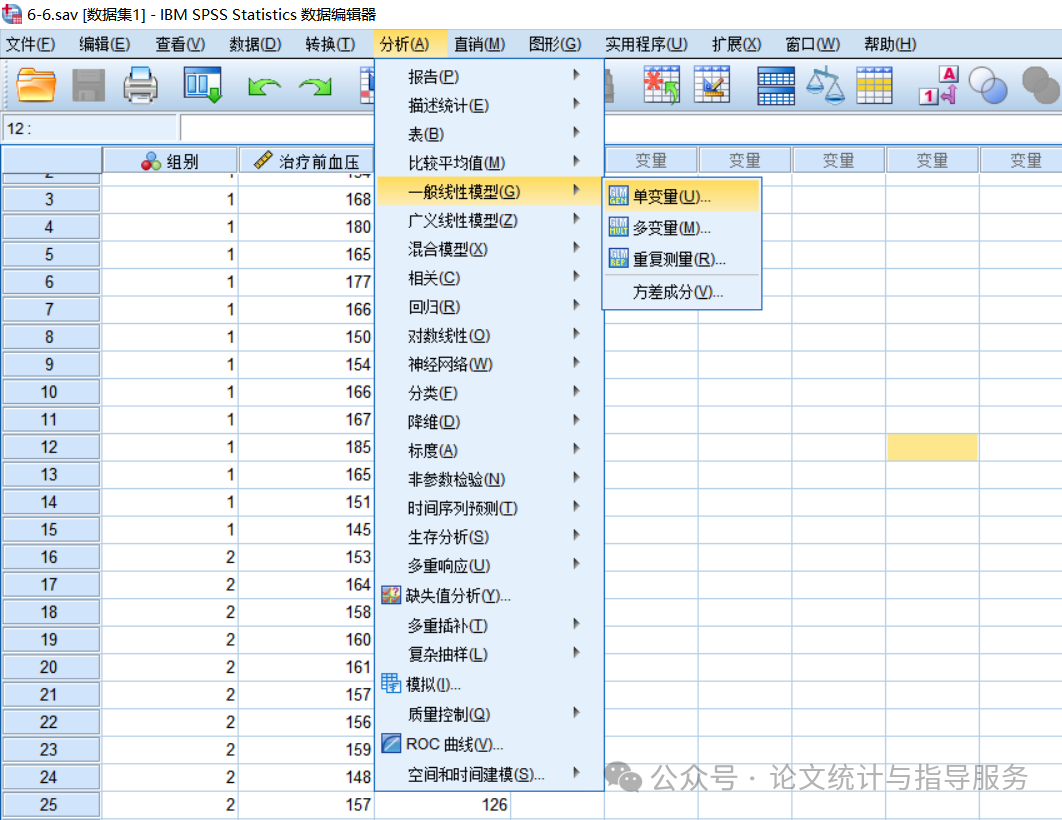 1.2协方差分析案例:为了研究A、B两种降压药物对高血压病人收缩压的降压效果,研究人员将受试者随机分成两组,分别接受A、B降压药物之类2个月后,测量患者的收缩压。具体数据如下,试问A、B两种降压药物对收缩压的降压效果有无差异。因治疗前的血压专业上会对治疗后的血压存在影响,因此本案例采用协方差分析。(详情可参考公众号文章:SPSS协方差分析)