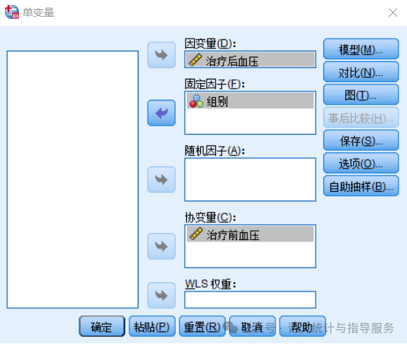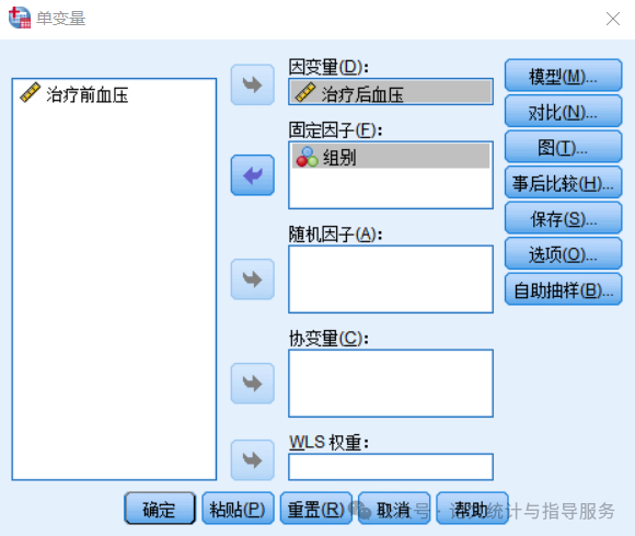 2、在【单变量】对话框中,分别把“治疗后血压”、“组别”和“治疗前血压”选入右边的【因变量】、【固定因子】和【协变量】栏中;