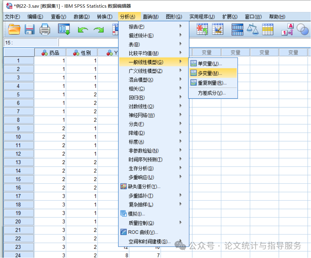 二、一般线性模型-多变量,可用于多元方差分析。案例:为了研究某疾病的治疗效果,研究者观察了A、B、C三种药物对该疾病的治疗效果,治疗效果判断指标为血液指标Y1、Y2。同时结合性别因素。请比较不同药物和性别的血液指标Y1、Y2的差异有无显著性,以及药物和性别是否存在交互作用。(详情可参阅公众号文章:SPSS多元方差分析)