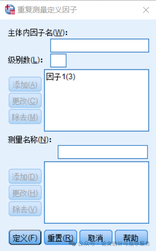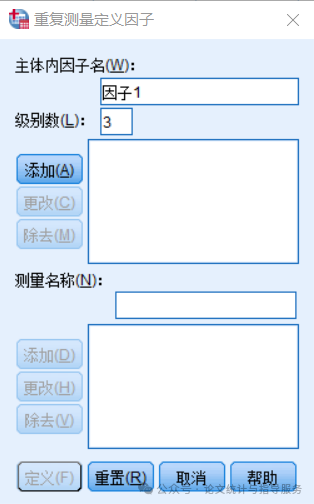 (2)在“重复测量定义因子”对话框中。“级别数(L)”框中输入重复测量次数“3”,单击“添加”按钮。点击左下角的“定义”按钮,弹出“重复测量”对话框