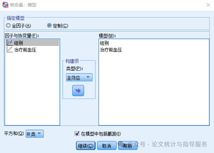 3、点击【模型】,选择【定制】,将“组别”和“治疗前血压”添加到【模型】变量里,【构建项】中选择【主效应】,点击【继续】;