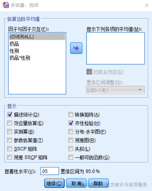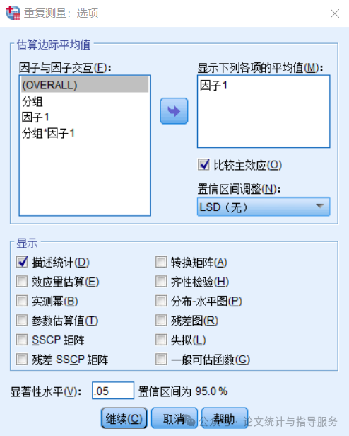 (5)单击右侧的“选项”按钮,将“因子1”移至右侧的“显示下列各项的平均值”框中,并将勾选“比较主效应”复选框,勾选“描述性统计”复选框,点击“继续”。最后,在主对话框中单击“确定”按钮运行。