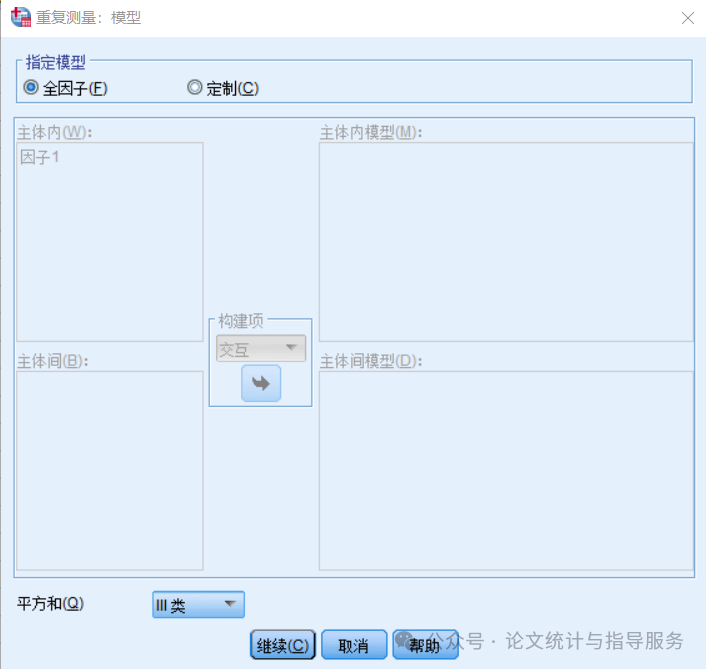 (4)单击“模型”按钮,在弹出对话框中,选择“全因子”模型,单击“继续”按钮。