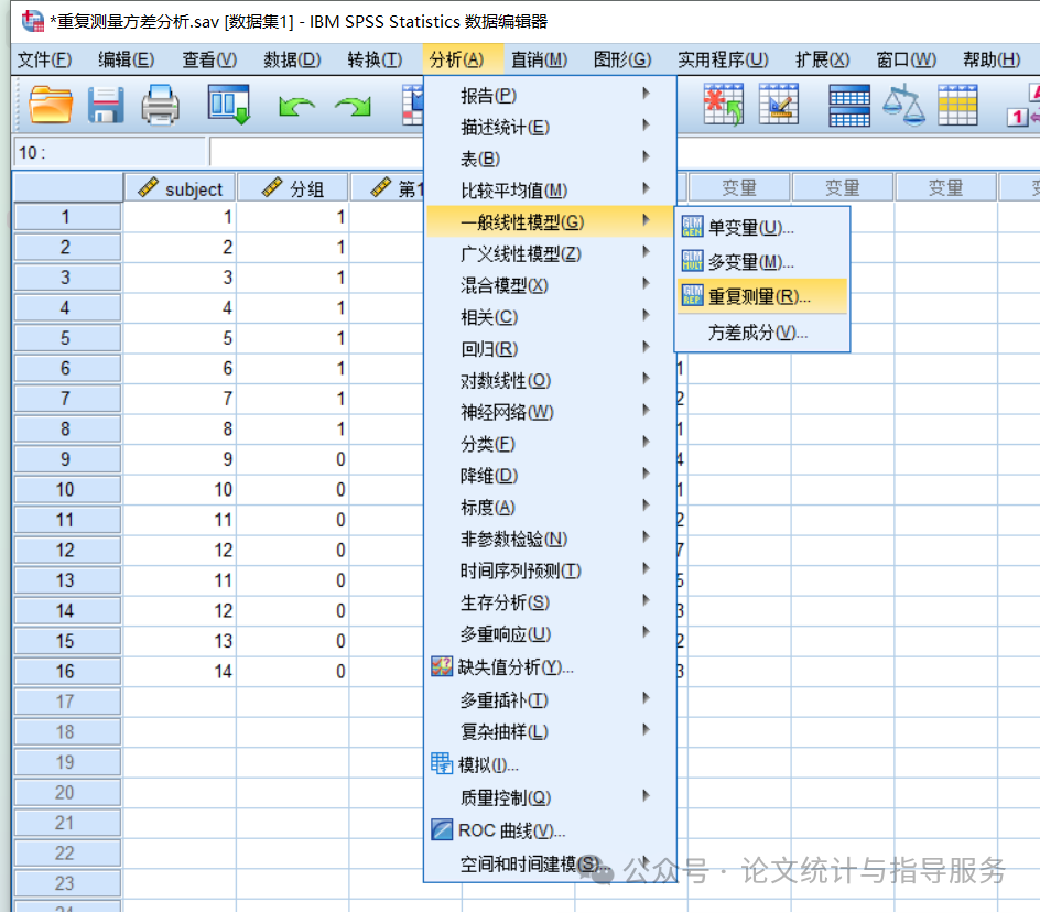 三、一般线性模型-重复测量,可用于重复测量方差分析。案例:研究者为了研究某减肥药物的减肥效果,在某大学中抽取16名肥胖学生,随机分成两组,第一组采用常规减肥方法减肥,第二组采用减肥药物减肥,并于实验开始的第1、2、3个月分别测量学生体重的减重情况,分析减肥药物组减肥效果是否优于常规减肥方法组。(详情可参阅公众号文章:SPSS重复测量方差分析及不等距重复测量数据处理)