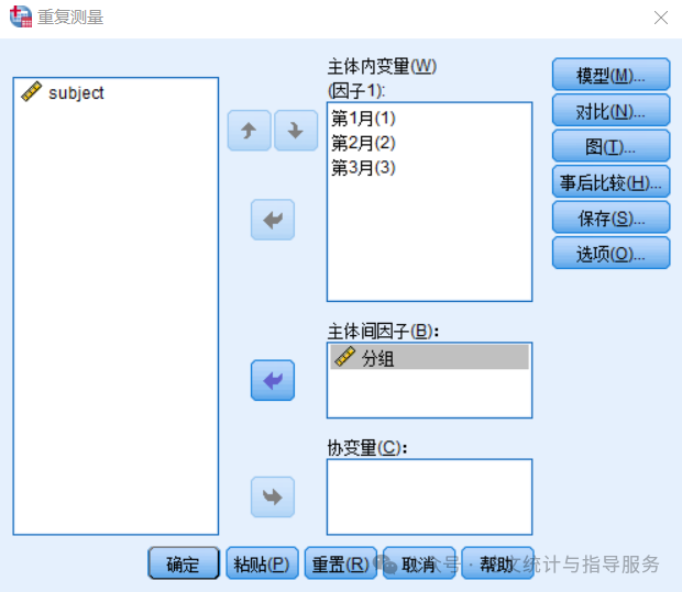 (3)在“重复测量”对话框中,将3次测量变量“第1个月”、“第2个月”和“第3个月”按照框中测量的顺序,放入右侧“主体内变量”框中。如若顺序出现差异,单击“主体内变量”左侧的上下箭头来调整顺序,注意顺序一定不能出错。将“分组”变量放入“主体间因子”框中。