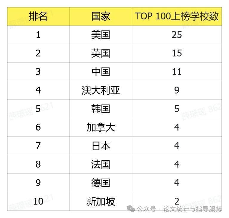 前一百名上榜的高校中,美国以25所遥遥领先,英国拥有15所,第三名是中国,共11所上榜,澳大利亚紧随我国,以9所学校上榜,韩国拥有5所学校上榜。在亚太地区中,中国和澳大利亚的排名稳步提升,体现了教育实力在不断发展壮大。