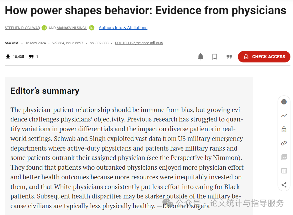 2024年5月16日Science在线发表了美国卡耐基梅隆大学Manasvini Singh教授的研究论文“How power shapes behavior: Evidence from physicians”。通过研究医生如何应对处于不同社会地位的病人,揭示了一个惊人的现实:权力的存在不仅可以改变资源分配,还能潜在改变医务人员的医治行为和病人的治疗结果。这一发现挑战了人民对医疗公正的传统认识,迫使我们重新考虑权力在医疗行业中的角色和影响。