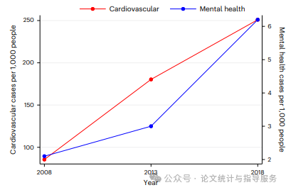 图2:疾病患病率的时间趋势。根据《中国卫生统计年鉴》2009-2019年的数据,中国心血管疾病和精神相关疾病的患病率情况。