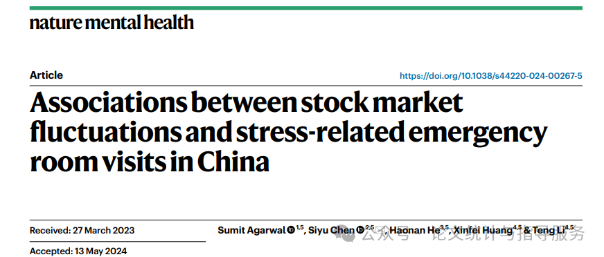 2024年6月7日,北京大学何昊楠、中山大学黄新飞、暨南大学陈思宇等合作在Nature Mental Health在线发表题为“Associations between stock market fluctuations and stress-related emergency room visits in China”的研究论文,该研究检测了中国股市波动与急诊就诊的关系。该研究通过对2009年1月1日至2012年12月31日期间北京市三家最大医院每日急诊就诊记录的分析,结果发现每日市场回报率下降一个百分点,当天心血管疾病病例数就会增加0.185例(P=0.040,置信区间CI为0.009至0.361,即增加约0.7%),精神类疾病病例数增加0.020例(P=0.060,CI为0至-0.041,即增加约2.5%)。