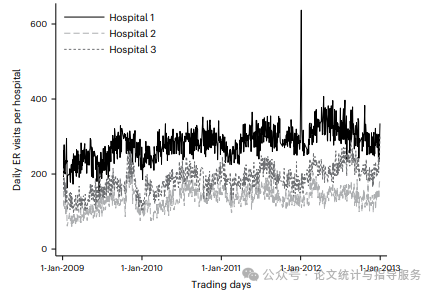 图1:样本期间(2009年1月1日至2012年12月31日)每家医院的每日总门诊量。