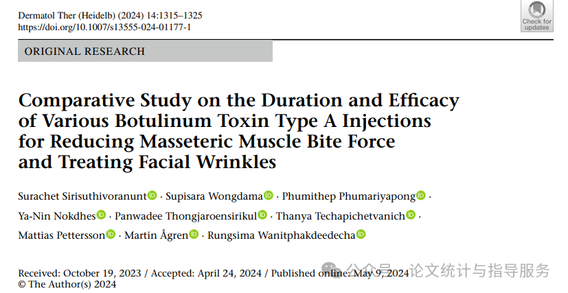 2024年5月,泰国玛希隆大学诗丽拉吉医院医学院和瑞典乌梅奥大学医学院研究团队在Dermatologic Therapy 上发表了题为“Comparative Study on the Duration and Effcacy of Various Botulinum Toxin Type A Injections for Reducing Masseteric Muscle Bite Force and Treating Facial Wrinkles” 的论文,该研究旨在比较市场上不同品牌的BoNT/A在减少咬肌咬合力和治疗面部皱纹方面的持续时间和疗效。研究结果得出,BoNT/A品牌间的结构差异对咬合力减少和皱纹治疗的持续时间和疗效没有显著影响。
