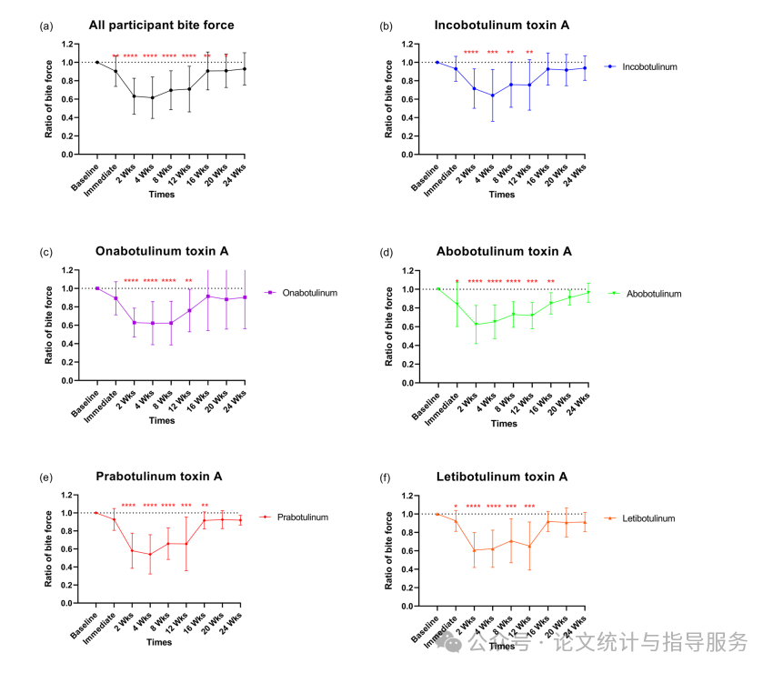 由于每位受试者的最大自愿咬合力量(MVBF)基线值不同,因此咬合力减少量以比值形式报告。在AboA组和PraboA组中,注射后咬合力减少持续至16周,而其他BoNT/A组的受试者则持续12周。值得注意的是,尽管AboA和PraboA组的MVBF减少持续时间更长,但16周时的咬合力减少量显著低于12周时。其研究结果表明,MVBF在注射后立即略有下降,并在干预后24周恢复到基线水平。相比之下,AboA组和LetiA组的咬合力在注射后立即下降。研究人员还比较了每种BoNT/A品牌之间的咬合力,但未发现对咬合力影响的统计学显著差异。