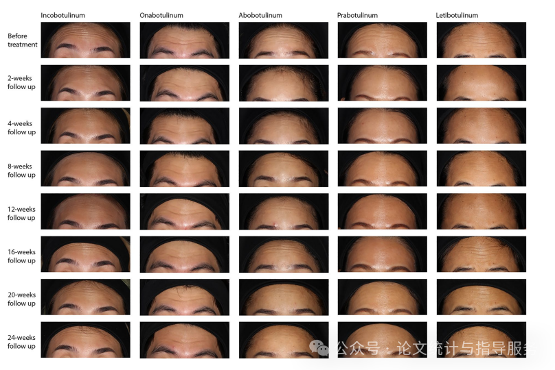 注射完成后,立即要求受试者使用10分制量表评估其疼痛程度。在后续访视中,再次拍摄受试者的面部表情照片(包括有表情和无表情),并在干预后2周、4周、8周、12周、16周、20周和24周记录MVBF。受试者使用5分制量表(0=恶化,1=稍有改善或无改善,2=相当改善,3=改善,4=极大改善)在每次访视时评估其皱纹改善情况。为避免偏倚,由不知情的皮肤科专家根据研究结束时的标准照片评估皱纹改善情况。记录包括疼痛、红斑、肿胀和面部不对称在内的副作用。