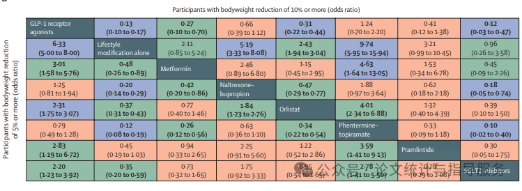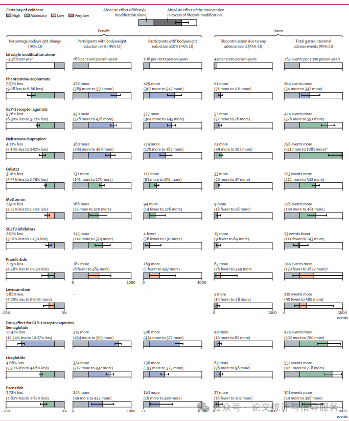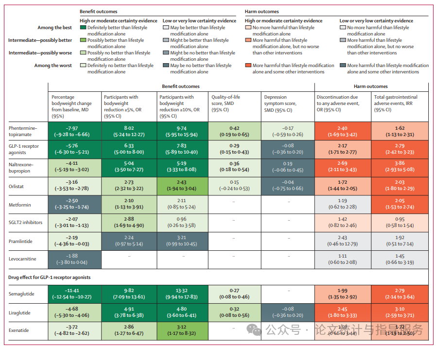 综上所述,对于超重和肥胖的成年人而言,在生活方式调整的基础上,芬特明-托吡酯和GLP-1受体激动剂在减重效果方面表现最佳。在事后分析中,司美鲁肽的减重效果明显优于其他研究药物。芬特明-托吡酯和纳曲酮-安非他酮导致的不良事件最多。(如需获取原文,可添加下面小编微信获取)。