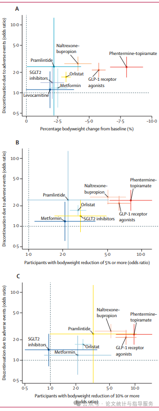数据显示,在体重百分比变化的结局方面,除左旋肉碱外,所有药物均能减轻体重,其中芬特明-托吡酯和胰高血糖素样肽-1(GLP-1)受体激动剂效果最佳(点估计值和95%置信区间均大于最小重要差异MID,且不与MID重叠,证据确定性为中等)。与单独生活方式调整相比,除普兰林肽外,所有药物均能使更多比例的受试者体重减轻5%或更多。除二甲双胍、钠-葡萄糖协同转运蛋白2(SGLT2)抑制剂和普兰林肽外,所有药物均能使更高比例的受试者体重减轻10%或更多。芬特明-托吡酯、GLP-1受体激动剂和纳曲酮-安非他酮在体重减轻5%或更多和10%或更多方面证明最为有效(证据确定性高)。