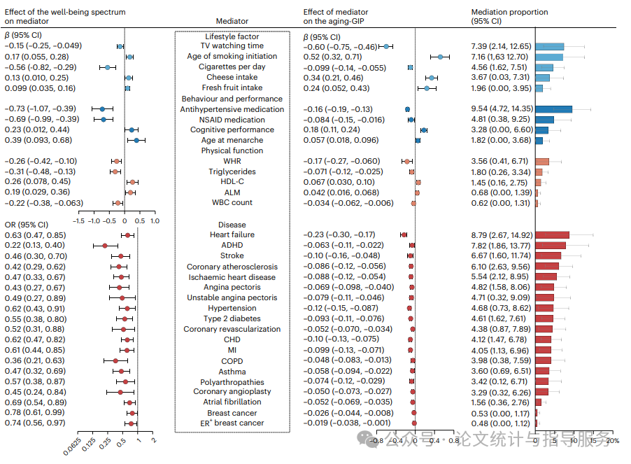 2024年6月,上海交通大学医院附属瑞金医院王天歌团队在《Nature》子刊“Nature human behavior”发表题为“Mendelian randomization evidence for the causal effect of mental well-being on healthy aging”的研究论文,研究确定了33个作为心理健康谱系与遗传独立老龄化表型之间的中介因素:主要是生活方式(如看电视和吸烟)、行为(如药物使用)和疾病(如心力衰竭、注意缺陷多动障碍、中风、冠状动脉粥样硬化和缺血性心脏病),每个中介因素的介导比例均超过5%。这些发现强调了心理健康在促进健康老龄化中的重要性,并为解决因心理健康不佳而导致的老龄化差异提供了预防目标。
