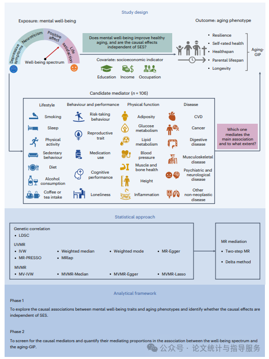 研究人员利用心理健康谱系及其四个维度(包括生活满意度、积极情绪、神经质和抑郁症状)的遗传工具(n=80,852至2,370,390),进行了双样本孟德尔随机化分析,以评估心理健康对遗传独立老龄化表型(GIP,一种稳健且具有代表性的老龄化表型)及其组成部分(包括恢复力、自评健康、健康寿命、父母寿命和长寿)(n=36,745至1,012,240)的因果效应。该研究分析调整了收入、教育和职业因素。所有数据均来自欧洲血统人群中现有的最大规模全基因组关联研究。