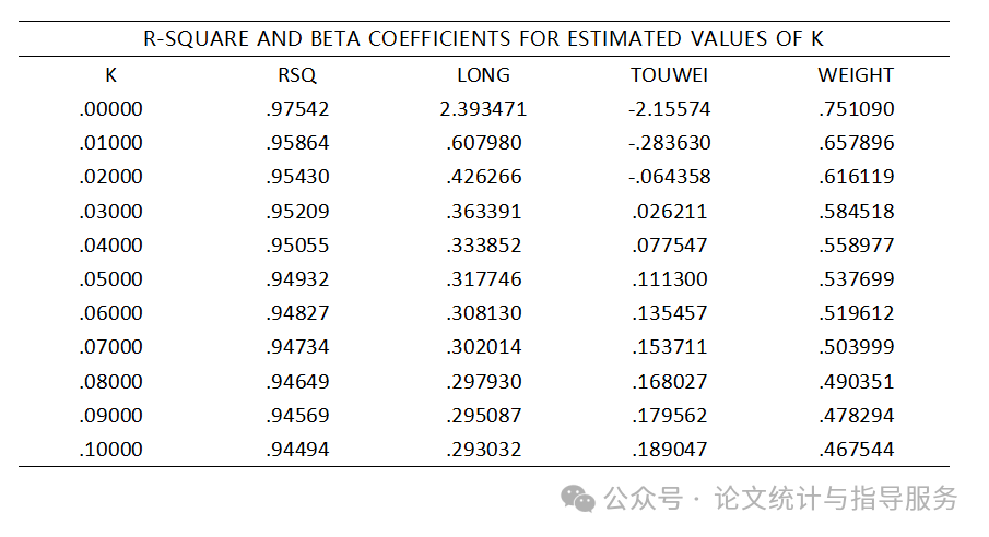 下面给出了不同k值下的决定系数和个变量系数的变化情况,因岭回归在计算时首先会对全部变量进行标准化,故输出只给出标准化回归系数,无常数项。从下表可见当k=0.04-0.06时,回归系数开始趋于稳定,本例选择K=0.05,得到因变量y的回归方程为=0.318*zlong+0.111*ztouwei+0.538*zweight。该方程对应的决定系数为0.949,比原方程0.975略低,但避免了共线性的影响所带来的方程不准确。岭回归分析通过丢失少量信息换取回归方程的合理性。