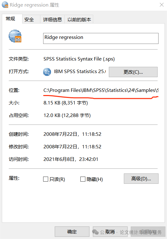 好多同学反应,“Ridge regression.sps程序所在路径“不知道在那里找。我们可以通过在SPSS安装文件里面,右上角搜索Ridge regression文件,找到Ridge regression(Simplified Chinese那种),右击选择”属性“,可以找到Ridge regression程序所在路径。如下图: