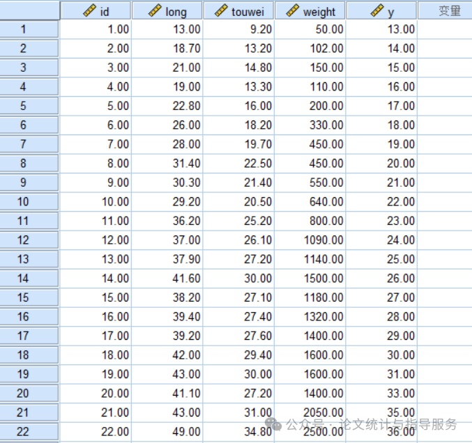 某医师收集了胎儿的身长、头围、体重和胎儿周龄数据,希望通过身长、头围、体重来预测胎儿周龄,建立回归方程。这些观测值均是连续性数值变量,所以很容易想到建立一个多重线性回归方程来解决问题。