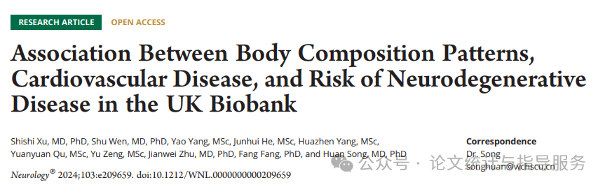 2024年7月24日,四川大学华西医院宋欢团队研究人员在《神经病学》期刊上发表了一篇题为 "Association Between Body Composition Patterns,Cardiovascular Disease,and Risk of Neurodegenerative Disease in the UK Biobank " 的研究论文,该研究旨在探讨身体组成模式与神经退行性疾病风险之间的关联,并探究心血管疾病(CVDs)在这一关联中的中介作用。研究结果表明,“中心性肥胖”、“肌肉力量”和“上肢为主的脂肪分布”等身体组成模式与神经退行性疾病及脑衰老之间存在显著关联,且这些关联部分由心血管疾病介导。这些发现强调了通过改善身体组成和早期管理心血管疾病来降低神经退行性疾病风险的潜力。