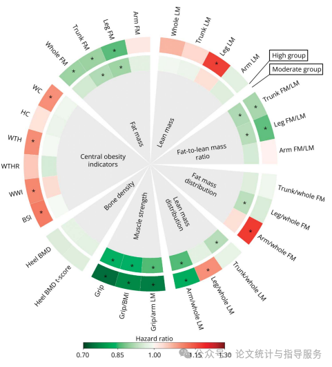 身体成分单个组分与神经退行性疾病之间的关联部分类似于身体成分模式的结果。例如,研究人员观察到大多数中心性肥胖指标与神经退行性疾病发病率的升高呈正相关(高与低比较,腰臀比的风险比[HR]=1.10[1.04–1.17]),而所有与肌肉力量相关的指标则与神经退行性疾病的发病率呈负相关(高与低比较,握力的风险比=0.73[0.68–0.78])。此外,研究人员还注意到上肢/全身脂肪量(FM)和下肢/全身瘦体重(LM)的比值也分别显示出正相关(高与低比较,上肢/全身FM的风险比=1.19[1.12–1.26];下肢/全身LM的风险比=1.10[1.04–1.17])。另外,研究者发现上肢/全身LM的比值与神经退行性疾病发病率的降低相关(高与低比较,风险比=0.81[0.76–0.86])。