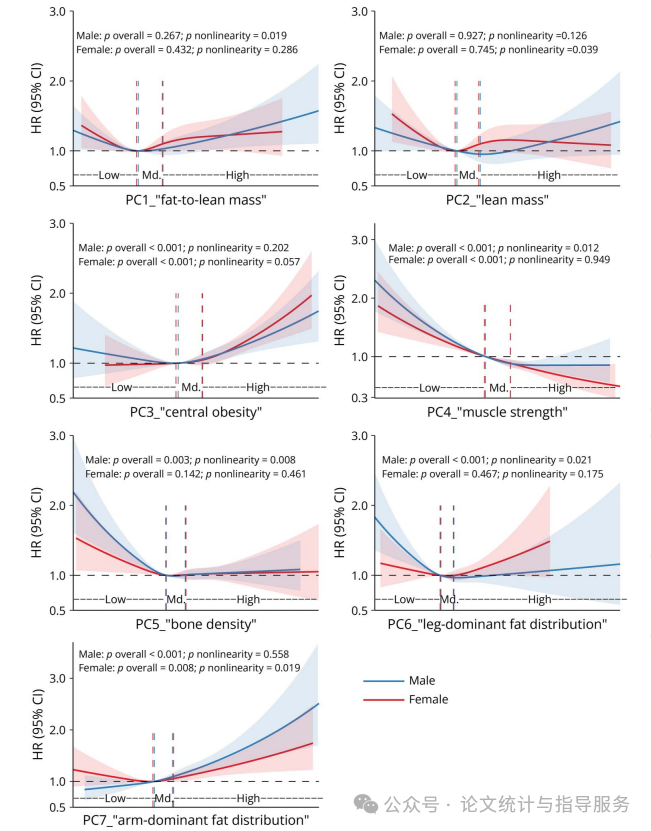 【已识别体成分模式与神经退行性疾病发病率的关联性,并分别针对男性(蓝色)和女性(红色)进行独立分析】