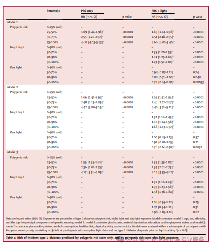 2型糖尿病的多基因风险在模型1至模型3中均是新发2型糖尿病的稳健预测因子。当在模型1至模型3中作为附加预测因子一起纳入时,多基因风险和夜间光照是2型糖尿病发病率的稳健且独立的预测因子。相邻多基因风险四分位数之间观察到的较高糖尿病风险与亮夜(90-100百分位数)与暗夜(0-50百分位数)之间观察到的较高糖尿病风险在量级上相当。