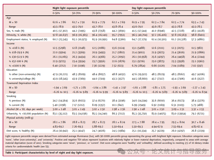 研究完成了对84,790名参与者的分析,这些参与者具有完整的每日光照数据,且在光照追踪前未患有2型糖尿病(排除了4085例)。最终分析中的光照数据来源于每位参与者平均(±SD)6.92±0.54天的完整光照数据。从光照追踪到研究终点的平均(±SD)随访期为7.91±1.2年,最长随访期为9.55年。在670,844人年的随访期间,共观察到1997例2型糖尿病病例(每1000人年2.98例)。数据详细列出了不同光照暴露百分位数组的糖尿病病例数量和百分比。