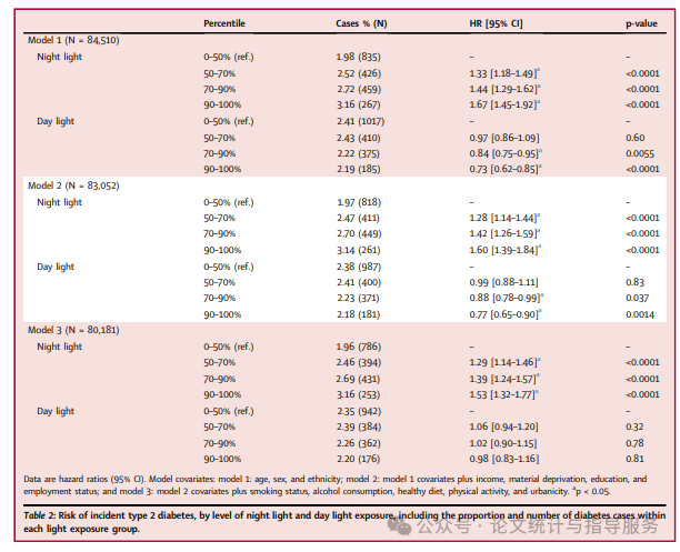 在模型1和模型2中,对于光照暴露位于90-100百分位数(模型1:HR = 0.73 [0.62–0.85],p < 0.0001;模型2:HR = 0.77 [0.65–0.90],p = 0.0014)和70-90百分位数(模型1:HR = 0.84 [0.75–0.95],p = 0.0055;模型2:HR = 0.88 [0.78–0.99],p = 0.037)的参与者,日间(07:30–20:30)光照暴露与较低的2型糖尿病风险相关,而与最暗的0-50百分位数相比。然而,在模型3中进一步调整生活方式因素后,日间光照并未显著预测糖尿病风险。