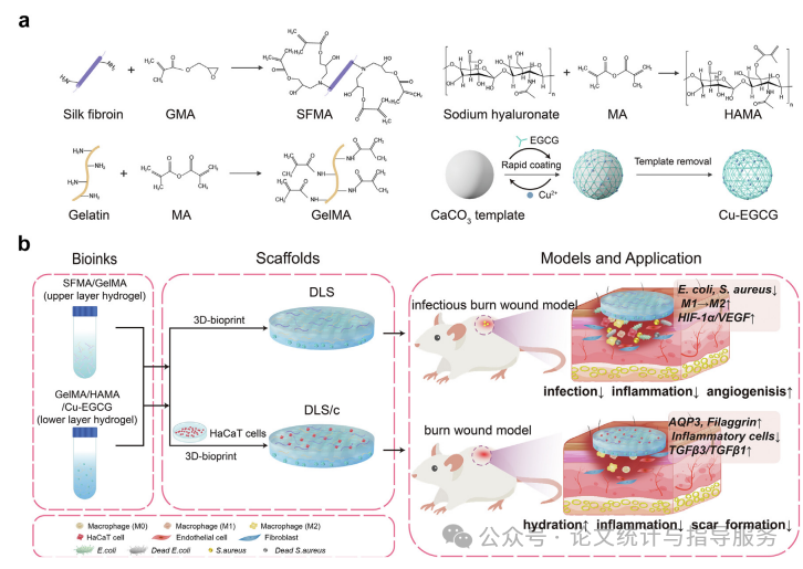 该研究中,研究人员采用数字光处理(DLP)3D打印技术,以丝素蛋白甲基丙烯酸酯(SFMA)/明胶甲基丙烯酸酯(GelMA)生物墨水作为上层,透明质酸甲基丙烯酸酯(HAMA)/GelMA生物墨水作为下层,制作了一种双层水凝胶(DLH)。研究人员对DLH的可打印性和生物相容性进行了全面评估。为解决感染和再生不足的问题,研究者将Cu-EGCG整合到下层水凝胶(LLH)中,开发出了双层人工皮肤(DLS)。研究团队在体外和感染性烧伤伤口模型中研究了DLS的抗菌、抗炎和促血管生成特性。此外,为解决烧伤伤口暴露导致的低水化和瘢痕形成等问题,研究者将表皮细胞封装在上层水凝胶(ULH)中,整个结构(包括上下两层)被称为DLS/c。研究人员使用烧伤伤口模型评估了DLS/c的有效性。通过包括苏木精-伊红(H&E)染色、马松三色染色和免疫荧光染色在内的多种染色技术,评估了DLS/c对伤口愈合的影响。该研究介绍了一种有效的深烧伤伤口愈合方法——3D打印双层皮肤替代品DLS和DLS/c,该方法适用于大规模生产和烧伤救治中的临床应用。它为治疗感染性烧伤伤口和促进无瘢痕烧伤皮肤修复提供了明确的指南和策略,为临床应用提供了具有显著潜力的组织再生材料。