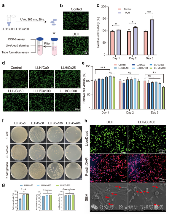 对于旨在植入体内的生物材料而言,与生物体的最佳相容性至关重要。研究人员使用上层水凝胶(ULH)提取物、下层水凝胶(LLH)提取物以及培养基培养人皮肤成纤维细胞(HSF),以评估细胞的存活和活力。到第3天,ULH和LLH/Cu0至LLH/Cu100组中的HSF细胞均呈现均匀分布,几乎无死细胞(红色),表明这些水凝胶的无细胞毒性。CCK-8实验进一步证实了这一观察结果,显示从第1天到第3天,ULH的细胞活力优于对照组,如先前所述。此外,LLH/Cu0至LLH/Cu100组在3天后的细胞活力与对照组相似(P > 0.05,单因素方差分析),而LLH/Cu200组则显示出明显下降(LLH/Cu200 vs. 对照组,P < 0.01,单因素方差分析)。这些发现表明,ULH和LLH/Cu0至LLH/Cu100在细胞应用中展现出良好的生物相容性前景。