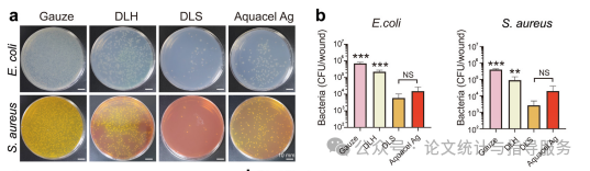 为了评估DLS的体内抗菌效果,研究人员使用了大肠杆菌和金黄色葡萄球菌感染的大鼠模型,并在第3天检测伤口上的细菌存在情况。伤口覆盖物包括纱布、DLH、DLS以及Aquacel Ag。使用纱布处理后的伤口中,大肠杆菌的菌落形成单位(CFU)约为每伤口7.1 × 105 CFU,金黄色葡萄球菌的CFU约为每伤口4.0 × 105 CFU。DLH处理将这些数值降低至每伤口大肠杆菌约2.2 × 105 CFU,金黄色葡萄球菌约9.1 × 104 CFU。然而,Aquacel Ag和DLS处理表现出了更优异的抗菌性能,每伤口大肠杆菌的CFU分别为7.2 × 103和5.9 × 103 CFU,金黄色葡萄球菌的CFU分别为1.9 × 104和2.7 × 103 CFU。值得注意的是,DLS处理后的琼脂平板上CFU数量最少,在四组中最低,比纱布和DLH处理低两个数量级。这些发现共同表明,DLS在体内展现出了卓越的抗菌活性。