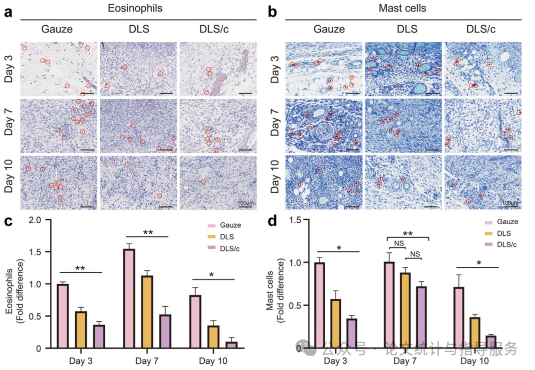 为了区分各组伤口部位的炎症差异,研究人员对嗜酸性粒细胞、肥大细胞和极化巨噬细胞进行了染色分析。DLS/c组在三个组别中表现出显著差异(P < 0.05,单向方差分析)。到第14天,DLS/c组中的巨噬细胞数量最少,这表明其迅速过渡到重塑阶段。值得注意的是,DLS/c组在整个过程中始终保持着最低的M1/M2比例,并且在第7天,该比例(0.32 ± 0.01)与纱布组(1.61 ± 0.22)和DLS组(0.81 ± 0.09)相比存在显著差异(P < 0.05,单向方差分析)。这些结果表明,DLS/c组通过有效地将巨噬细胞极化为M2表型,从而减少了伤口的炎症反应。