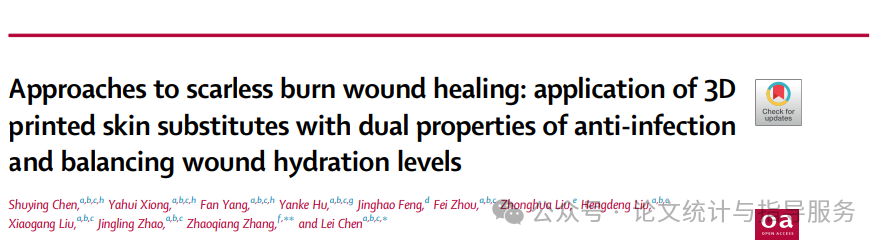 2024年7月27日,中山大学研究团队在Lancet在线发表了一篇题为“Approaches to scarless burn wound healing: application of 3D printed skin substitutes with dual properties of anti-infection and balancing wound hydration levels “的研究论文,该研究设计并制造了一种三维(3D)打印双层水凝胶(DLH),旨在解决烧伤后瘢痕形成的问题。DLH展现出适宜的孔隙率、适当的机械性能和优异的生物相容性。DLS表现出强大的抗菌性能,通过调节巨噬细胞极化发挥抗炎作用,并可能通过HIF-1α/VEGF途径促进血管生成。在DLS/c组中,动物实验显示表皮形成、屏障功能和表皮水分含量均有显著改善,同时炎症反应减轻。此外,Masson三色染色和天狼星红染色结果显示,DLS/c组中真皮胶原的结构和比例与正常皮肤相似,表明其在无瘢痕伤口愈合方面具有巨大潜力。