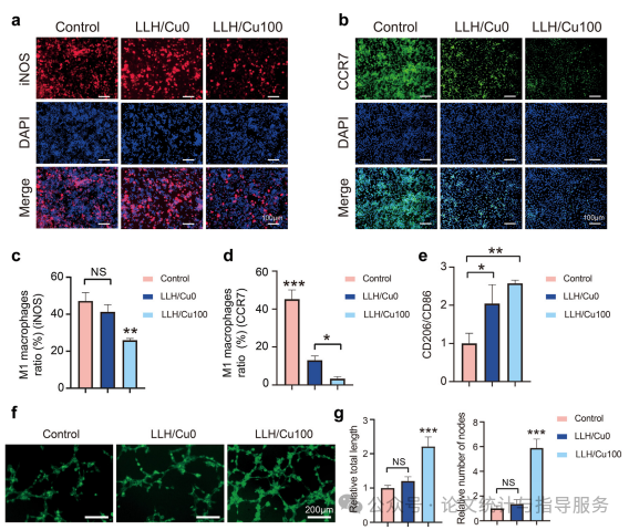 巨噬细胞在伤口愈合过程中起着至关重要的作用,并被分为促炎型M1和抗炎型M2两类。在伤口愈合的后期阶段,M1巨噬细胞过多可能导致慢性炎症、伤口愈合延迟或疤痕形成增加。先前的研究已表明Cu-EGCG具有抗炎作用。因此,为了评估LLH/Cu100的抗炎效果,研究人员进行了体外实验。为了研究LLH/Cu100组对巨噬细胞极化的影响,研究者对M1巨噬细胞标志物iNOS和CCR7进行了免疫荧光染色。结果表明,与对照组(47.16 ± 4.5%)和LLH/Cu0组(41.30 ± 3.2%)相比,LLH/Cu100组中M1巨噬细胞(iNOS+)的数量显著减少(25.91 ± 1.0%)。CCR7(M1巨噬细胞标志物)的免疫荧光染色也表明,LLH/Cu100组中巨噬细胞向M1型的极化受到抑制。qRT-PCR实验显示,与其他组相比,LLH/Cu100组的CD206/CD86比率更高,表明LLH/Cu100中M2/M1的比率增加。