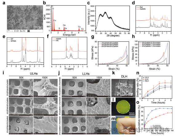 研究人员通过扫描电子显微镜(SEM)分析评估了Cu-EGCG的形态结构。Cu-EGCG呈现出完美的圆形形态,表面光滑,平均尺寸约为2.5微米。能谱仪(EDS)映射表明,Cu是Cu-EGCG的主要成分,占总含量的18.27%。此外,X射线衍射(XRD)分析揭示了Cu的显著衍射峰,证实了颗粒的相态。GelMA、SFMA和HAMA均含有甲基丙烯酸酯功能基团,赋予它们光固化特性。这些功能基团在保留明胶(Gel)、丝素蛋白(SF)和透明质酸(HA)生物相容性的同时,增强了其抗压强度和稳定性。通过¹H核磁共振(NMR)光谱分析SFMA、GelMA和HAMA的结构,以确认所需甲基丙烯酰基团的存在。Gel上成功连接甲基丙烯酰基团的标志是在δ = 5.40 ppm和5.64 ppm处出现明显的峰。类似地,SFMA在5.67 ppm和6.11 ppm处也出现的明显甲基丙烯酸酯峰,证明了目标产物的生成。同样,HAMA也表现出甲基丙烯酸酯双键特征氢的峰(5.72 ppm和6.16 ppm)。