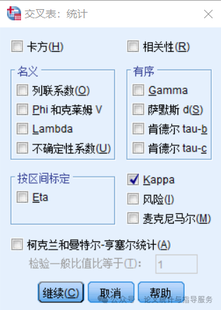 5、点击“统计”,勾选“Kappa”。点击“继续”,最后点击“确定”。