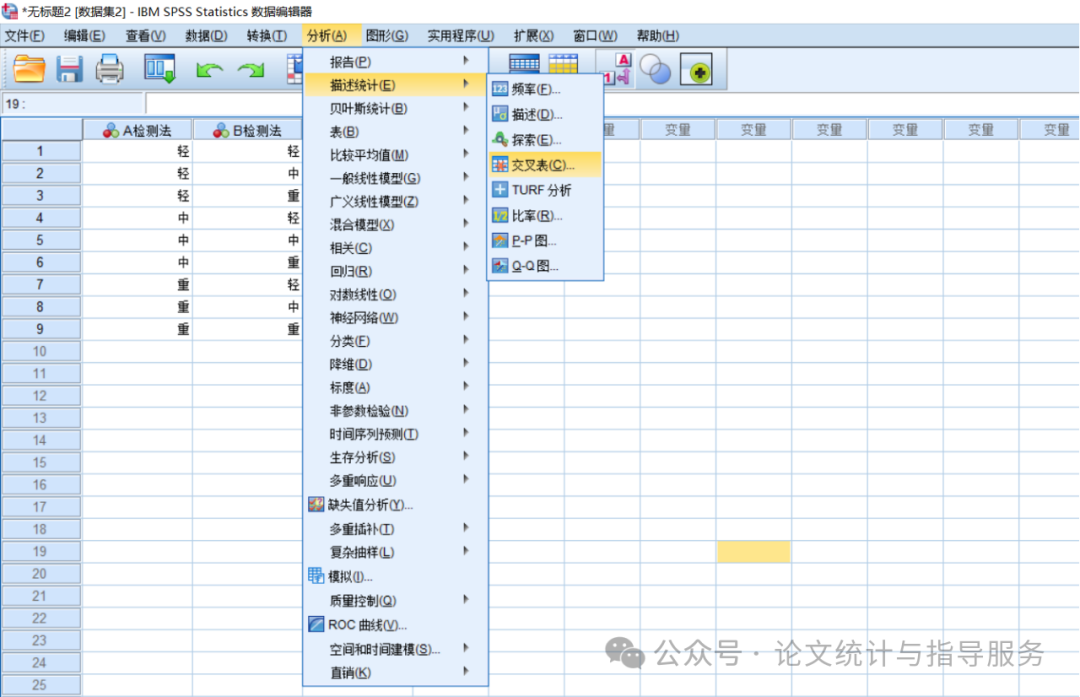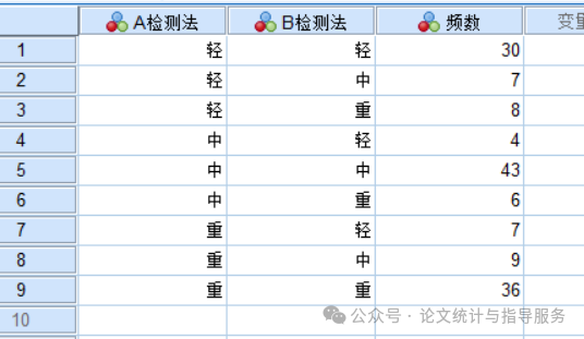 SPSS里录入数据如下(此处数据A、B检测法显示的是值标签):