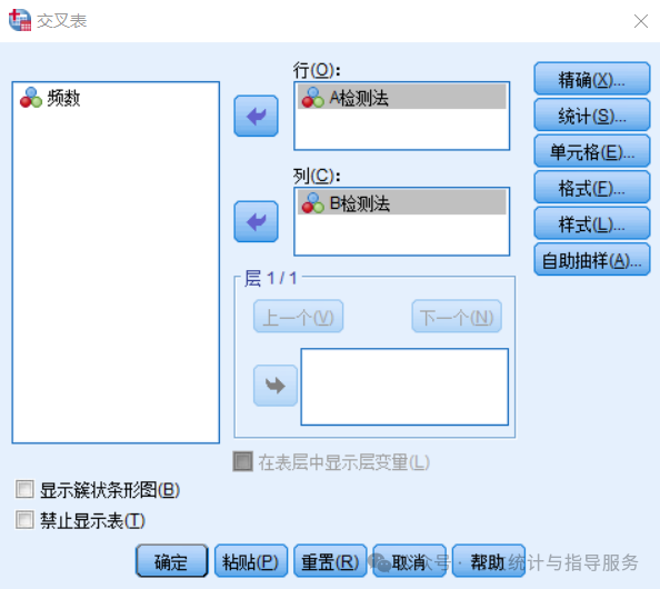 4、将“A检测法”选入“行”中,“B检测法”选入“列”中。