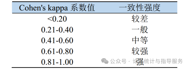 kappa一致性检验包括简单kappa检验,加权kappa检验和Fleiss´s Kappa检验。其中加权kappa用于有序分类变量的一致性检验。Fleiss´s Kappa检验,用于检验3项以上的一致性。Kappa系数强度判断如下:
